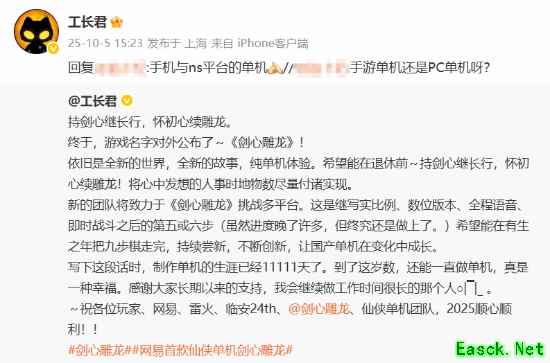随时随地玩!工长君再确认网易首款仙侠单机《剑心雕龙》登录平台