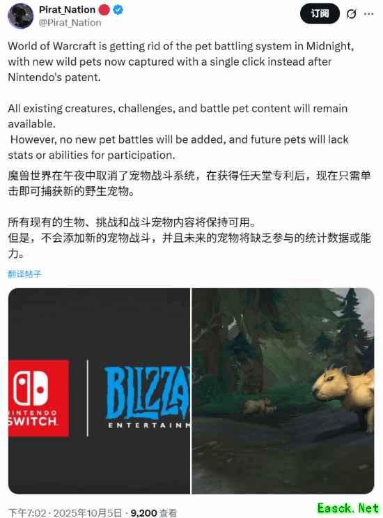 《WOW》将取消宠物对战系统:或为规避老任专利风险