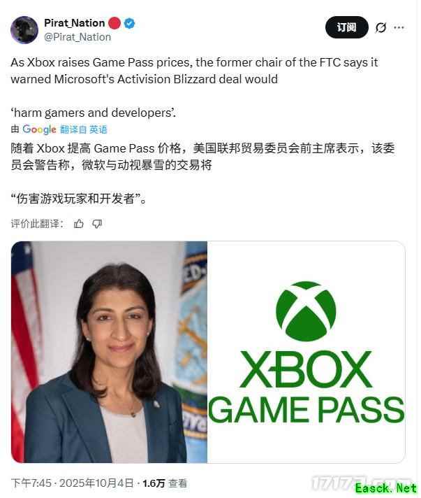 微软旗下Xbox Game Pass Ultimate服务价格近日正式上调至每月30美元,引发玩家与监管界的强烈反弹。前美国联邦贸易委员会(FTC)主席琳达·卡恩(Lina Khan)在社交媒体上公开批评微软,称其“大到不在乎”,在完成对动视暴雪的收购后肆意涨价,损害消费者利益。 此次涨价发生在Game Pass引入《使命召唤》系列新作《黑色行动7》等重磅内容之际,但并未换来玩家的认可。卡恩在X平台发布图表指出,自法院批准微软700亿美元收购动视暴雪以来,Game Pass价格已翻倍,同时伴随大规模裁员,这正是市场过度整合后企业滥用市场权力的典型表现。 |