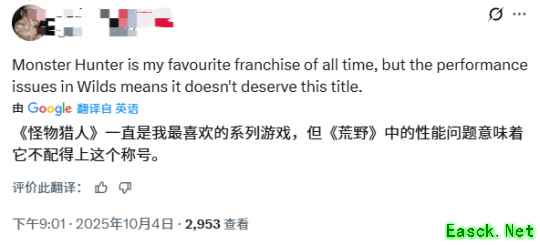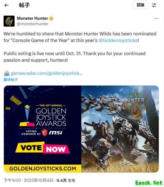 《怪物猎人:荒野》提名金摇杆遭玩家嘲讽