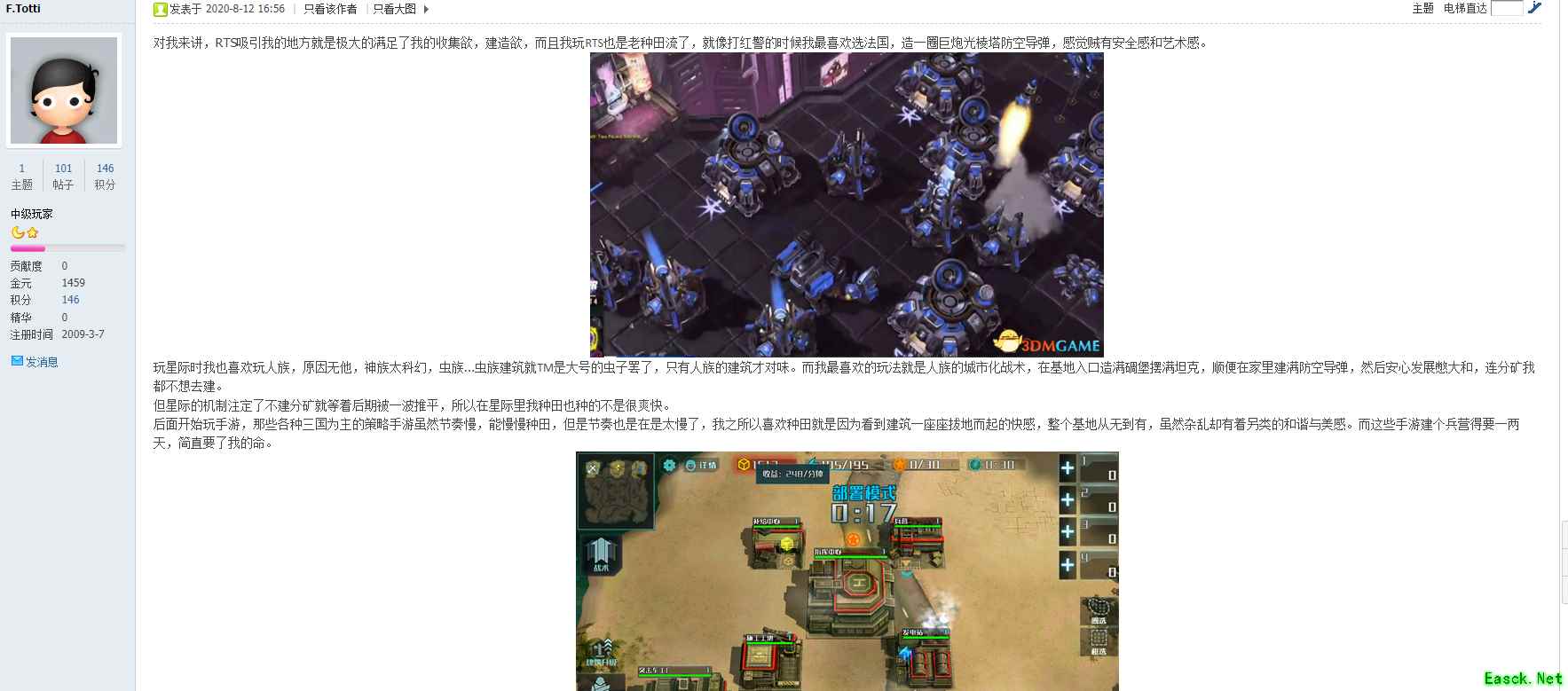 “对我来讲,RTS吸引我的地方就是极大的满足了我的收集欲,建造欲,而且我玩RTS也是老种田流了,就像打红警的时候我最喜欢选法国,造一圈巨炮光棱塔防空导弹,感觉贼有安全感和艺术感。