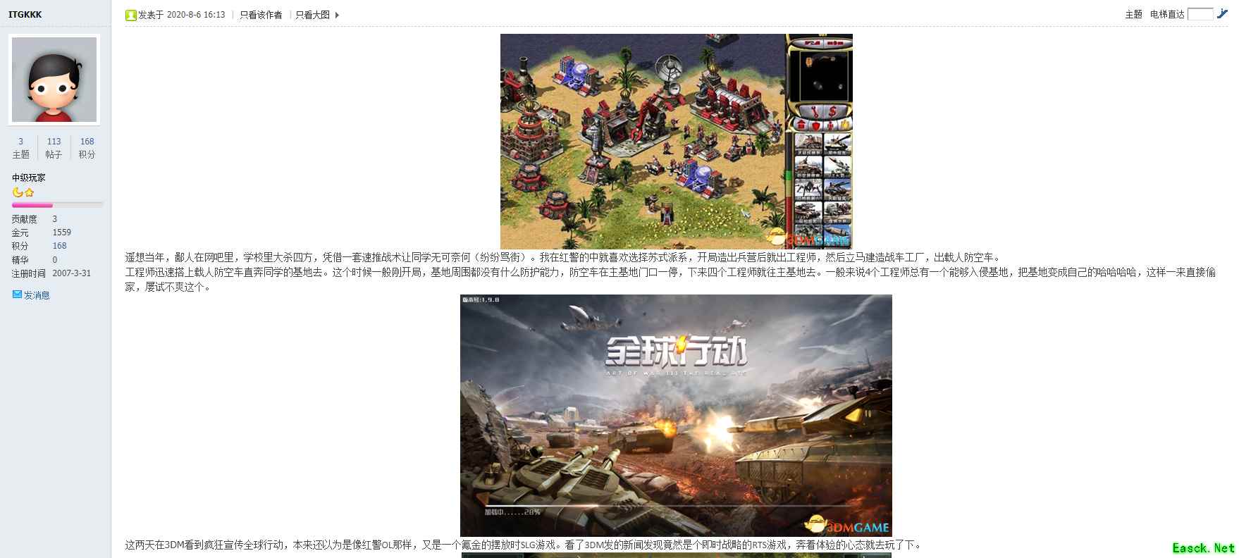 恰好这个时候我发现了全球行动,不得不说很对我胃口,自动生产的资源建筑让我不必费力开分矿,各种防御建筑能让我把基地围成密不透风的堡垒,至于战斗,反正有两个队友顶着嘛,我就憋超级武器和空军支援就行了,可以说全球行动刚好每一点都对上了我这个极端种田流的胃口,赞!” 可以看出这位玩家与大多数RTS玩家追求战斗的畅快不同,他更喜欢建设而不是破坏,RTS里即时建设所带来的快感,例如红警的拔地而起和星际的从地基开四一步步成型,非常符合他这种”种田流“玩家的需求。而《全球行动》的无论是玩法,建设都有着红警的影子,正好符合他的口味。 “终于满足了我在手机上玩到与有红警和星际那味儿的RTS手游了” ID为ITGKKK论坛网友分享了他对于《全球行动》的看法