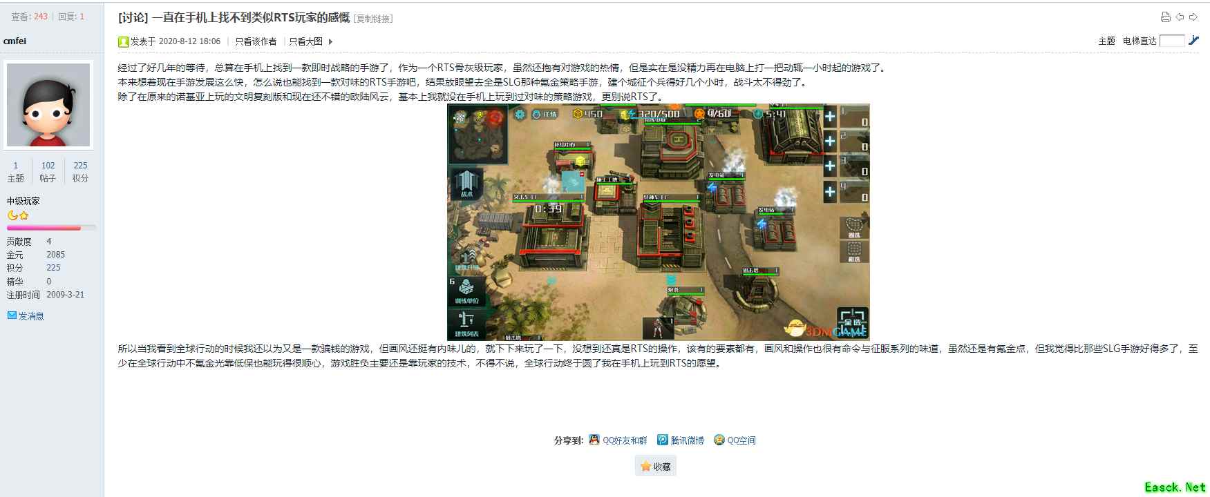 总的来说还是比较看好这个游戏的,可能对于我这类老玩家比较有吸引力,想扩展更多玩家还是得在游戏性上多多增进。” 这位玩家从液晶屏还没普及的CRT显示屏时代就成为了RTS玩家,可谓骨灰级RTS玩家,而他也从RTS老玩家的角度对《全球行动》也提出了一些看法与建议,总的来说《全球行动》的确“有内味儿”,但想要吸引更多玩家,还需要在游戏性方面以及玩法丰富度上多多精进。 “我已经厌倦了征个兵起步一天的SLG手游” 论坛网友cmfei在遍寻RTS手游无果后发出了这样的感叹。 “经过了好几年的等待,总算在手机上找到一款像样的即时战略手游了,作为一个RTS骨灰级玩家,虽然还抱有对游戏的热情,但是实在是没精力再在电脑上打一把动辄一小时起的游戏了。 本来想着现在手游发展这么快,怎么说也能找到一款对味的RTS手游吧,结果放眼望去全是SLG那种氪金策略手游,建个城征个兵得好几个小时,战斗太不得劲了。 除了在原来的诺基亚上玩的文明复刻版和现在还不错的欧陆风云,基本上我就没在手机上玩到过对味的策略游戏,更别说RTS了。 所以当我看到全球行动的时候我还以为又是一款骗钱的游戏,但画风还挺有内味儿的,就下下来玩了一下,没想到还真是RTS的操作,该有的要素都有,画风和操作也很有命令与征服系列的味道。