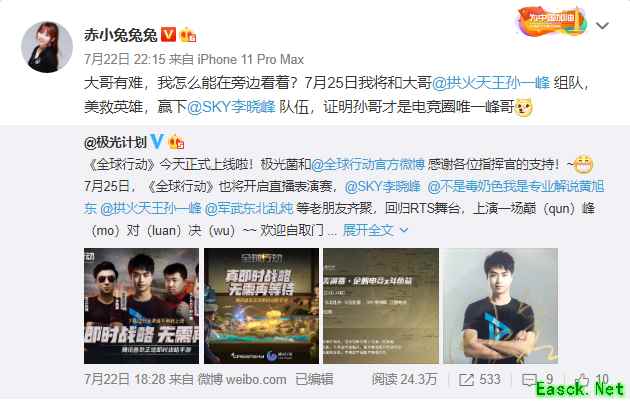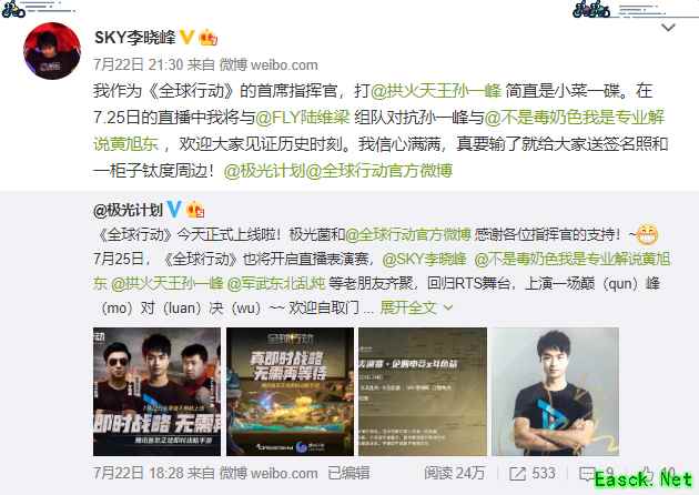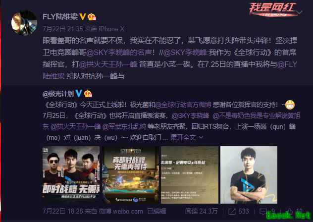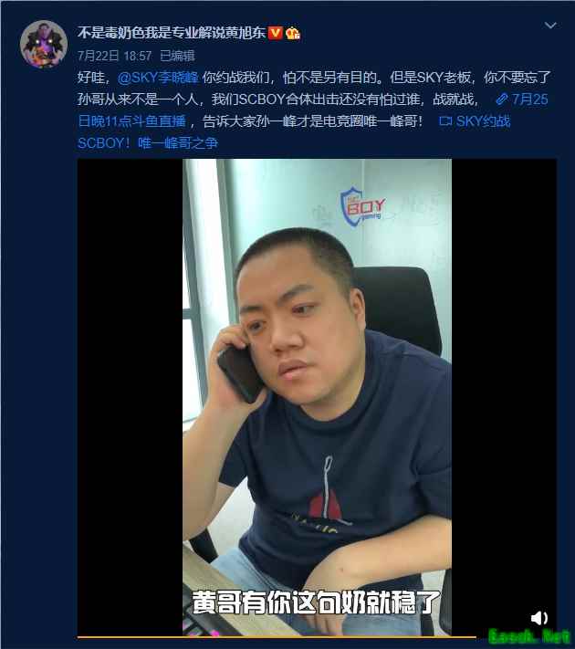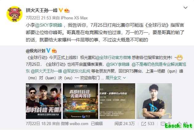 昨天晚上,专业解说黄旭东在微博曝出重磅“内幕”消息:SKY李晓峰约战了SCBOY,说 7月25日晚23点-24点在《全球行动》中一较高下,势要角逐比拼“谁才是电竞圈唯一峰哥”!