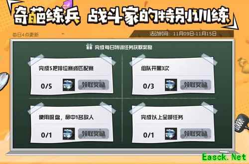 《奇葩战斗家》将在11月9日——11月15日开放限时特训活动,完成每日任务即可获得丰厚奖励!在活动期间登录游戏,并完成每日对局和组队任务,即可获得相应奖励! 任务分为“每日战斗”、“特训小队”、“随机中等战阶任务”,三个任务全部完成即可获得奇葩练兵宝箱一个! 活动四:第三期扭蛋机限时开放,传说级配件等你来拿!