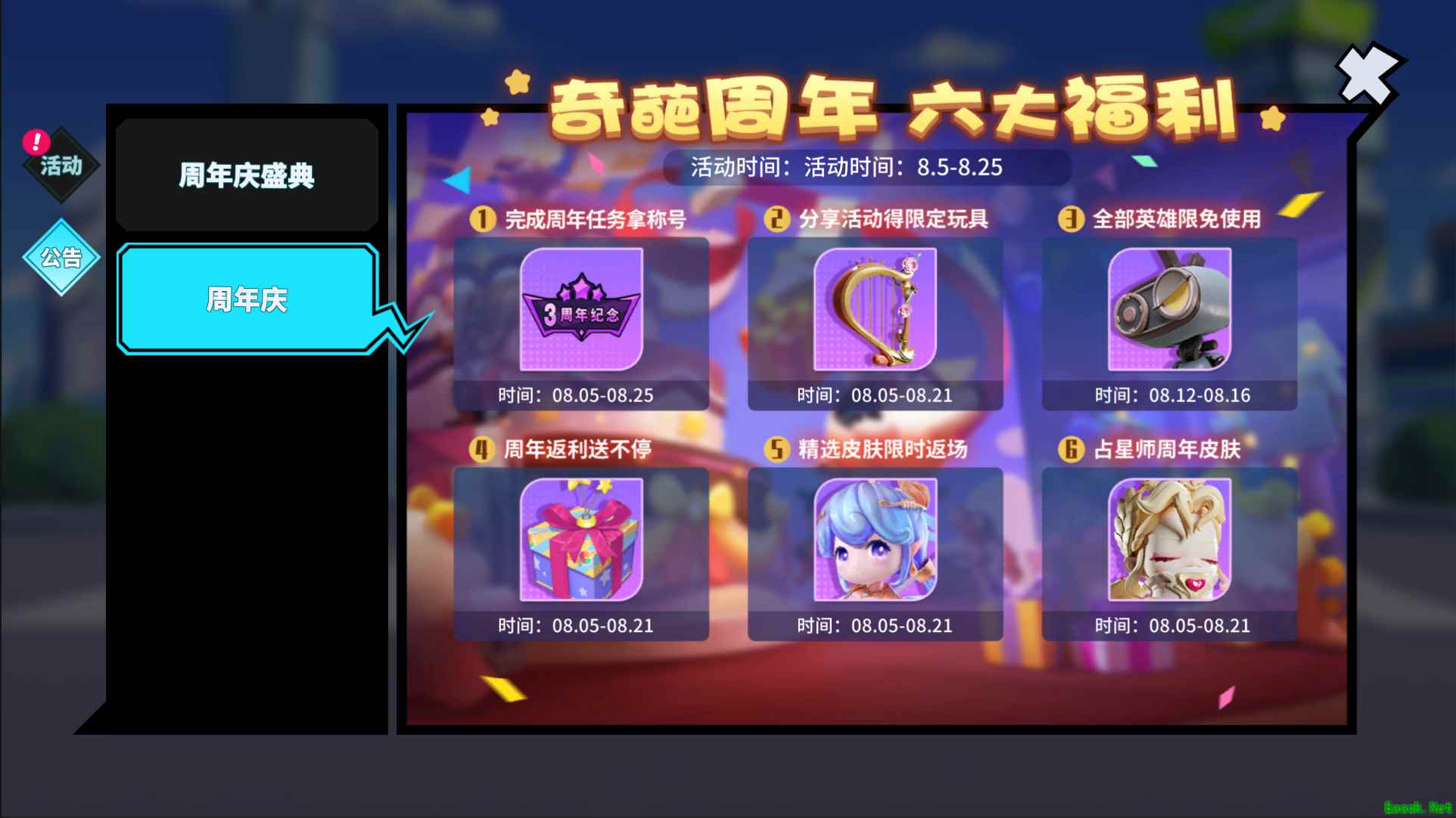 【生日宴会福利到】 唱响生日乐章,生日宴会盛大开幕!所有战斗家们皆可参与! 不仅有周年称号登录即送,还有活动限定玩具,全英雄限免等多种福利等待战斗家们的青睐!