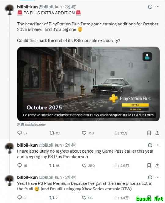 知名舅舅坤哥(billbil-kun)爆料,《寂静岭2:重制版》即将月10月21日登陆PlayStation Plus Extra这一档。 坤哥的爆料非常准,截至目前还没有失误过。此前他曾提前曝出Remedy的《心灵杀手2》很快将加入PS Plus Essential阵容,而在最近的State of Play直播节目上,索尼官宣了这一消息。 《寂静岭2:重制版》即将在明天迎来发售一周年,昨日有消息称这款游戏即将结束主机平台独占,登陆Xbox和Switch 2平台。 坤哥还在爆料的同时批评了微软,称自己已经取消了Game Pass订阅: |