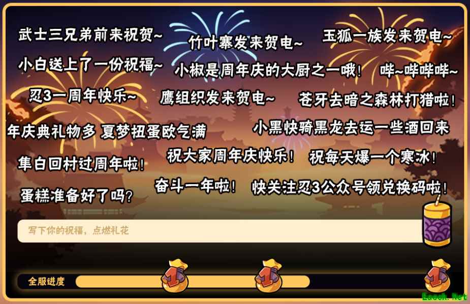 【三日狂欢全服生日祝福启动】 对于在8月23日至8月25日进入正题的周年庆典,都将围绕着需要全服忍忍们共同参与的“全服生日祝福”展开。首先,忍忍们进行祝福,首次可以获得有效期30天的周年庆限定聊天气泡;当祝福累积到一定进度便可以领取周年庆专属头像,而且还能免费领取随机道具奖励、庆典币甚至是周年庆限定抱枕;而当达成祝福目标后,登录游戏的忍忍们便可以领取一个可以让任意角色直升一级的——庆生蛋糕,这个蛋糕可以永久有效的,留待以后用也是可以的。此外,在庆典的三天内,只要登录游戏每天都可以领取到神秘礼包哦!