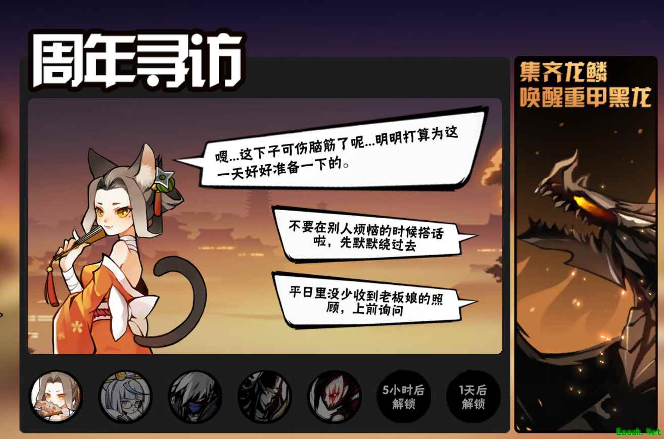 【投票寻访 庆典币全收获】 庆典币,此次《忍者必须死3》周年庆典中最让人欣喜的道具,它能启动扭蛋机,开出各种丰厚的奖励。而庆典币的获得也极为简单,“第一届人气角色大赏”的开启让玩家可以通过使用上线赠送的投票券,为自己喜欢的角色投票来获得庆典币! 另外,从8月15日开始的“周年寻访”,只要满足寻访的NPC的小心愿,也可以获得庆典币奖励。而且,在周年寻访中还可以获得黑龙重甲碎片,只要集齐7个就可以激活首次出现的通灵兽皮肤——重甲·黑龙哦!