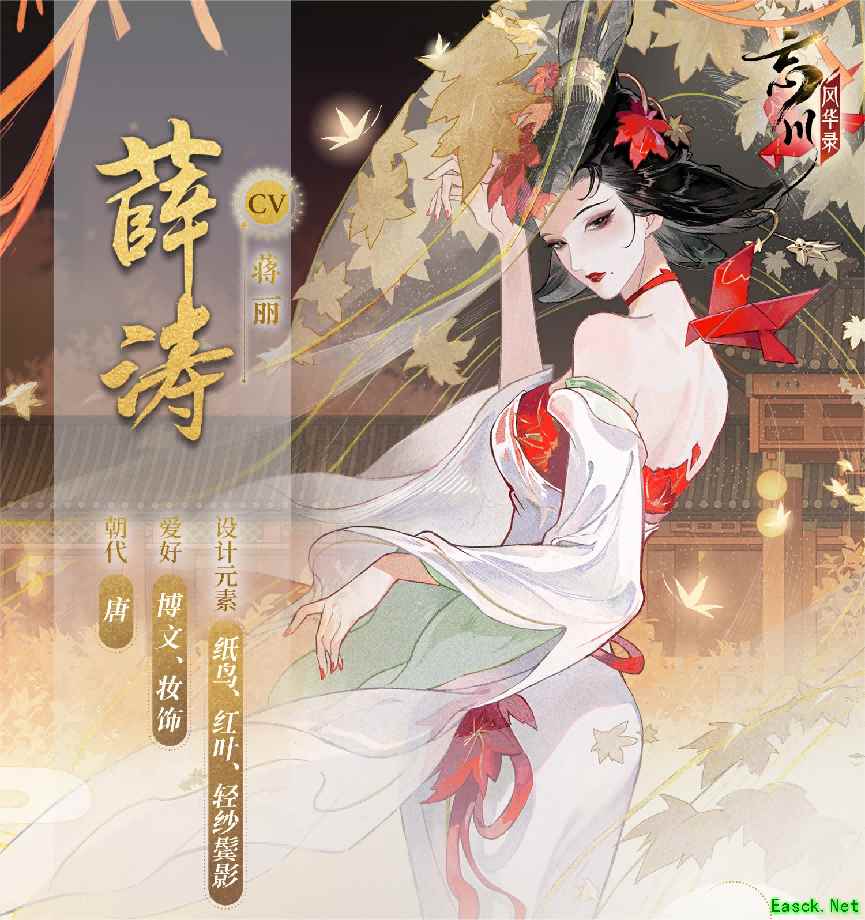 月下看花寄情诗赋,锦绣为形巧思为魂。基于正统历史改编的国风卡牌手游《忘川风华录》即将迎来全新访客,地品名士“薛涛”将翩然降临,为使君送上精心制作的纸笺,跃然纸上的,是她的机敏与才情,亦是风骨与风华。 诗才横溢,绝代风华 薛涛,字洪度,唐代乐伎、清客、女诗人。她生来聪慧,自幼随父来到成都,很早便展现出了出众的才华,父亲因病逝世后,薛涛与母亲的生活陷入窘迫困境,不得已之下加入乐籍,但她的人生并未就此沉沦,反而凭借非凡的诗才和出色的公文能力受召入幕府,先后辅佐了11任剑南西川节度使,还曾被举荐为“校书郎”一职,虽因格于旧例而未能实现,但却依然为她带来了“女校书”的美名。
