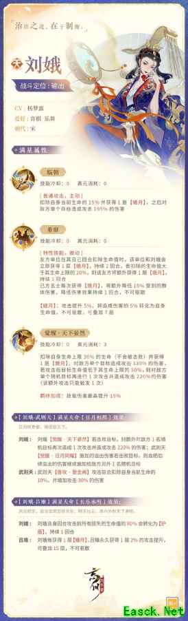 女主临朝,天下晏然 章献明肃皇后刘氏,相传名为娥,益州华阳人。从蜀地孤女至皇太后,她似皎皎明月自荒野升起。她是宋朝开国以来第一位临朝称制的女主,通晓史书,才智机敏,可堪与吕武齐名。在垂帘听政年间,她结束了“天书”运动、发行交子、兴修水利,可谓“进贤退奸,纲纪四方”,十余年天下晏然矣。 技能介绍:刘娥作为输出名士在忘川中作战,普通攻击会扣除自身当前血量15%并对1名目标造成195%的伤害,同时获得1层【娥月】,降低受到群攻输出15%。当持有【娥月】效果时,攻击提升5%并且造成伤害的5%会转化为吸血效果,可叠加7层。特性技能每当友方单位在自身回合内扣除血量时,刘娥和友方单位都会获得1层【娥月】,持续2回合。觉醒技能释放前会扣除自身血量30%,并对敌方名士造成330%的伤害,若该伤害使敌方名士血量低于50%则会对另一个随机目标造成220%的伤害。