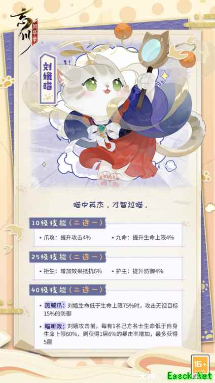 鼗鼓动,众喵听令 鼗鼓动,喵声响,喵中英杰,刘娥喵登场!刘娥喵才智机敏,通晓史书。若说刘娥是女中英杰,那么刘娥喵就是当之无愧的喵中英杰。刘娥喵不仅多才,也多艺。它也善于播鼗鼓,且深得刘娥的真传,每当刘娥喵播响鼗鼓时,众喵们皆会为其沉醉。 技能介绍:选择施威爪刘娥血量低于75%时,攻击无视15%的防御。选择喵听政,在刘娥攻击前,每有1位名士血量低于60%,将会提供6%的暴击加成,最多5层。阵容搭配上,可以选择武则天和刘娥的天明组合,极大增加两位名士的输出能力,同时其余名士可以选择祖冲之和孙策。装备选择上,可以选择文曲,增加大招破甲能力。