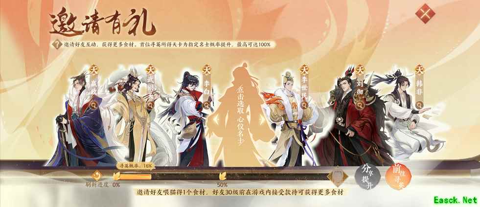 天卡UP六选一,爆率提升助成长!公测福利重磅追加,在新手卡池前30抽必出天卡的基础上,玩家“使君”可在李白等六位名士中选择任意心仪名士,新手卡池中该名士获取概率立达100%!在公测开启首周,三个副本(宝墟、镜渊、故世风云)的掉率均将额外提升50%,帮忙玩家“使君”加速成长。
