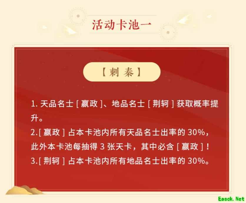 【活动卡池·刺秦】 在本卡池中,天品名士嬴政与地品名士荆轲的获取概率大大提升!各位“使君”可在此卡池中使用喵灵偶进行寻英,与二位名士相遇,共战忘川!