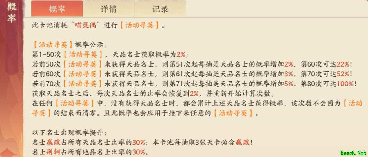 【活动说明】 在本次活动卡池中寻英,累计50抽没有获得天品名士时,会累计增加此后获得天品名士的概率,累计概率在任意活动卡池内共享(包含此后的新活动卡池),具体数值可通过寻英界面卡池详情查看!