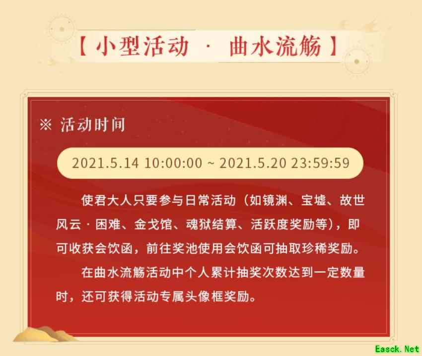 【活动时间】2021.5.14 10:00:00 —— 2021.5.20 23:59:59 【活动玩法】 在本次“曲水流觞”活动期间,各位玩家“使君”要参与日常活动,即可获取“会饮函”,如通关故世风云普通、故世风云困难、宝墟、仙喵指路副本,魂狱每日结算,参加金戈演武、沙盘演略战斗并取胜,活跃度达到100,奇遇/支线剧情任务,喵游园等。 【活动奖励】 忘川奖池由“使君”自行选择的4个珍稀物品与系统将随机生成的12个物品组成。玩家“使君”获得“会饮函”后,可前往奖池抽取珍稀奖励。每次换杯(刷新奖池)消耗一定数量的会饮函,换杯后当轮奖励及进度将被清空。 个人累计泛酒次数达到一定数量时,可获得“曲水流觞”活动专属头像框奖励。此外,所在服累计换杯次数达到一定进度时,玩家“使君”也能收获额外奖励。