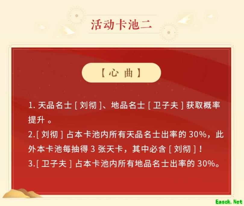 【活动卡池·心曲】 在此活动卡池内,各位玩家“使君”将有更高机率获得天品名士刘彻和地品名士卫子夫!各位“使君”可前往卡池参与寻英,获取两位名士星灵之力!
