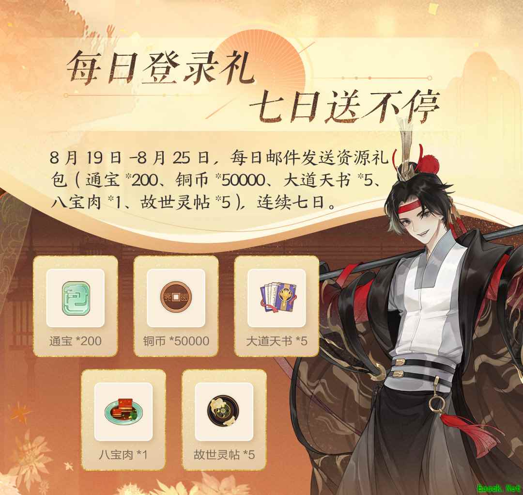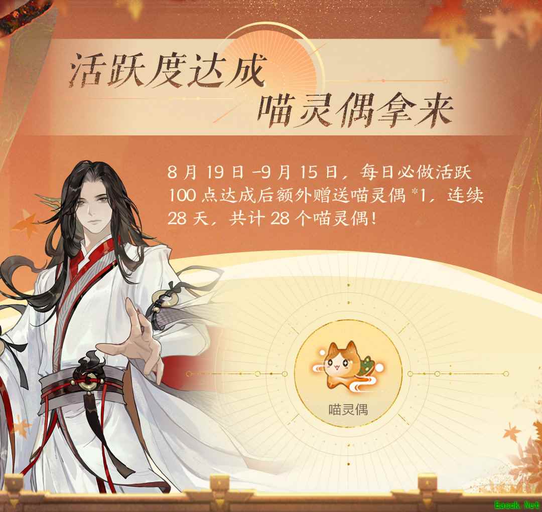 海量福利送不停! 8月19日更新完成后,玩家“使君”将会免费获得海量游戏道具,包括天卡六选一免费送、连续七日获得资源礼包、每日达到100活跃度还可领取喵灵偶!