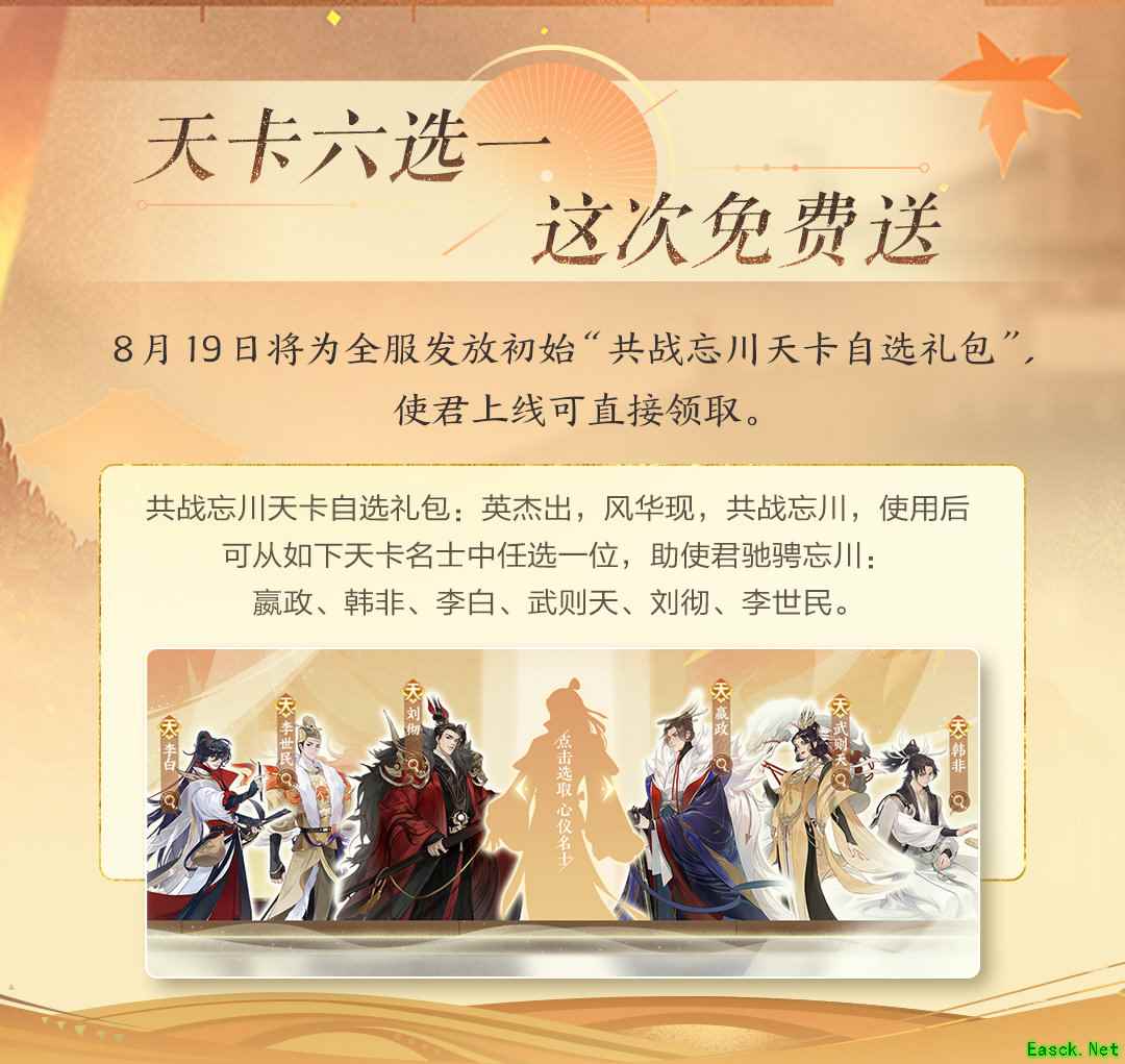 活动卡池:虎啸震江东&烽火连赤壁 活动时间:2021.8.19 10:00:00 – 2021.9.03 23:59:59 活动期间,在【虎啸震江东】卡池内,天品名士·孙策与地品名士·范蠡获取概率提升,在【烽火连赤壁】卡池内,天品名士·周瑜与地品名士·刘邦获取概率提升!