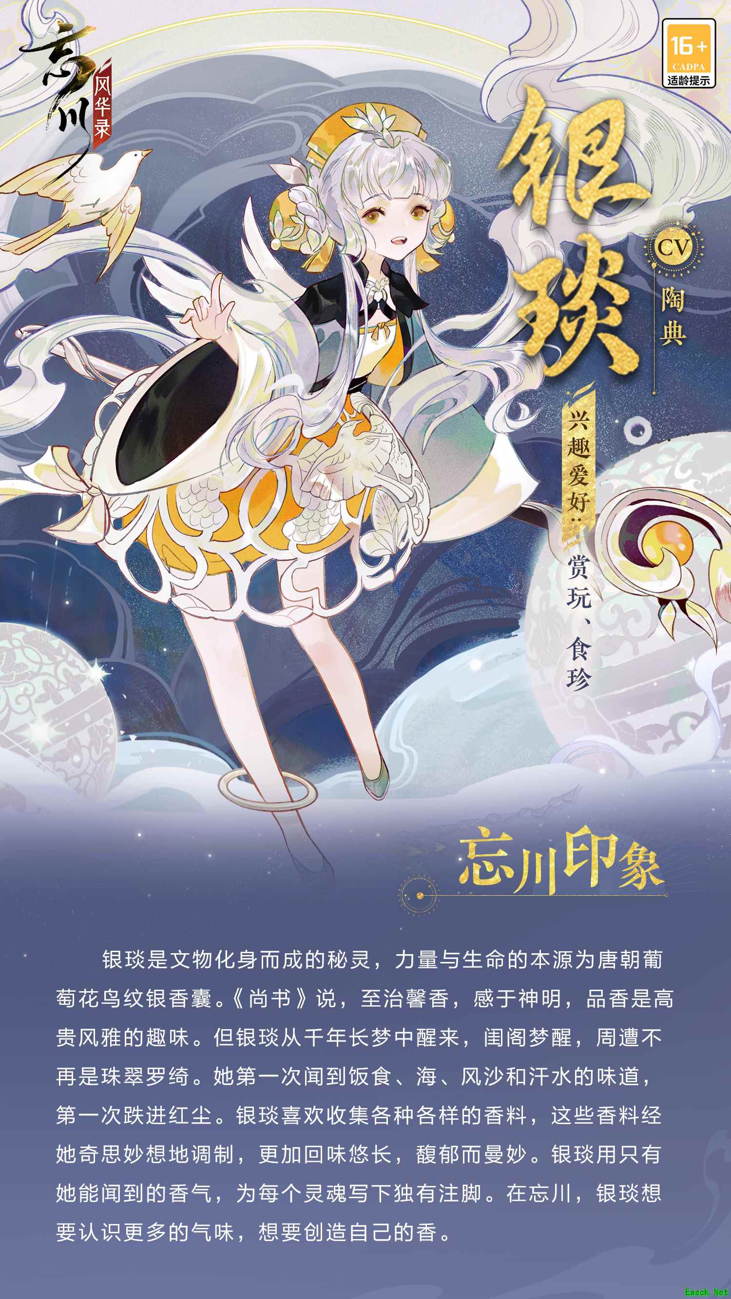 来到忘川,银琰闻到了完全不同于闺阁帐香的气味,红尘世界中的饭食、海、风沙和汗水……每种气味都能让她好奇欣喜。银琰喜欢收集各种不同的香料,经她一番调制,香气更加悠长而曼妙。在忘川,银琰想要体验千百般气味,期待着创造独属于自己的香。