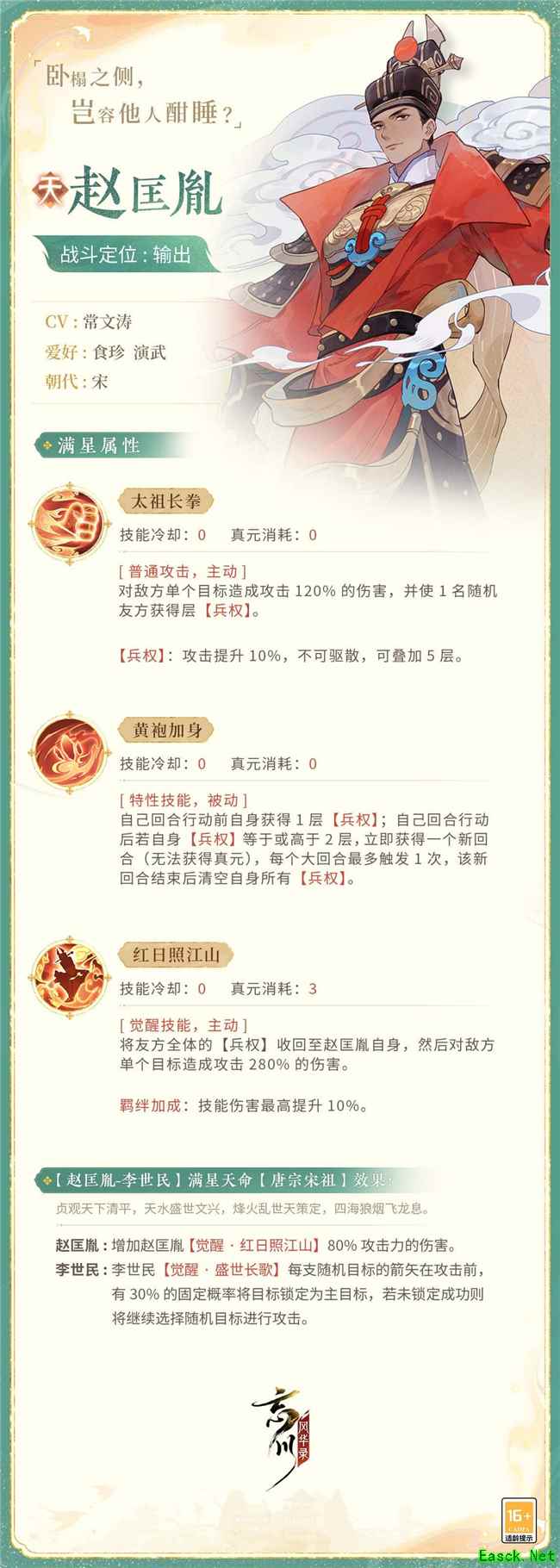 技能介绍赵匡胤在战斗中作为输出出战!他以技能【太祖长拳】为普通攻击,【黄袍加身】为特性技能,【红日照江山】为觉醒技能,触发羁绊时技能伤害最高提升10%,驯烈马,游四方!