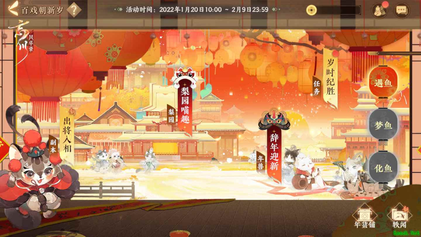 活动时间:2022.1.20 — 2022.2.9 23:59:59 活动内容:百戏朝新岁活动分为出将入相、辞年迎新、梨园喵趣等玩法。 出将入相有牡丹亭、龙凤阁、群英会、追鱼、文昭关5中活动副本,由名士们扮演戏中角色。挑战不同难度,通关后可获得寅虎元宝、戏本缺页、戏本等奖励。每个副本拥有对应的折子戏挑战观其,场景中还藏有京剧乐器、烟花筒等物品,等待玩家“使君”前去寻找!