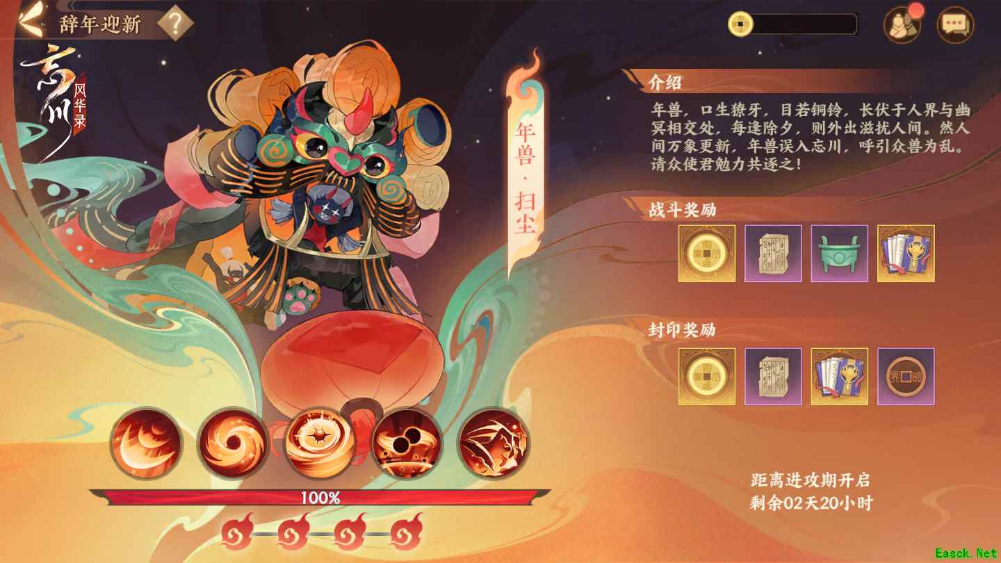 辞年迎新活动分备战期和进攻期两个阶段,1月20日 11:00~1月23日10:00为备战期;1月23日10:00~2月9日23:59:59为进攻期。玩家“使君”可在进攻期开始后,在辞年迎新副本中挑战年兽。活动记录所有雅社的伤害总和值,并根据排行发放奖励,所有参与过挑战年兽副本的雅社成员均可获得奖励!