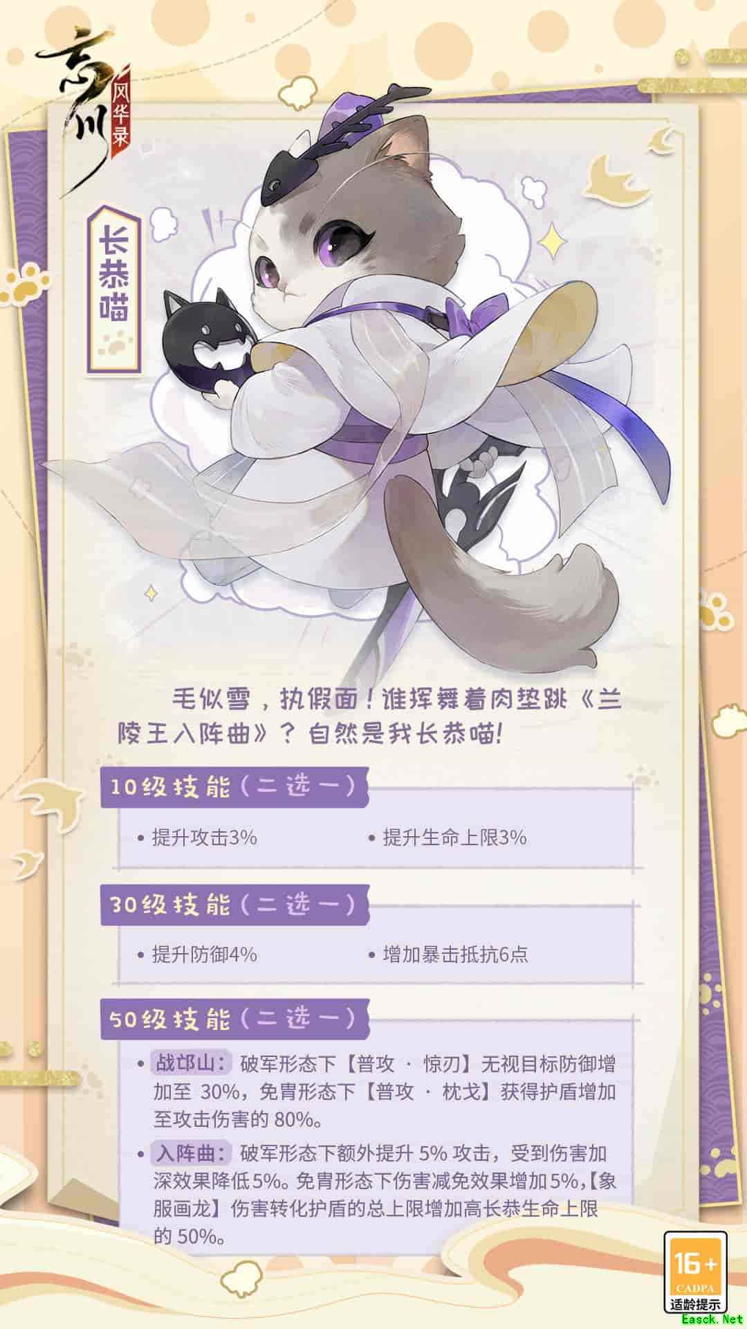 【长恭喵】 如何跳《兰陵王入阵曲》?自然是执假面,挥舞着肉垫!长恭喵也要像兰陵王一样英勇! 长恭喵等级提升至10级时,可解锁技能:提升攻击3%或增加生命上限3%;等级提升至30级时,可解锁技能:提升防御4%或增加暴击抵抗6点:等级提升至50级时,即可解锁技能【战邙山】或【入阵曲】。