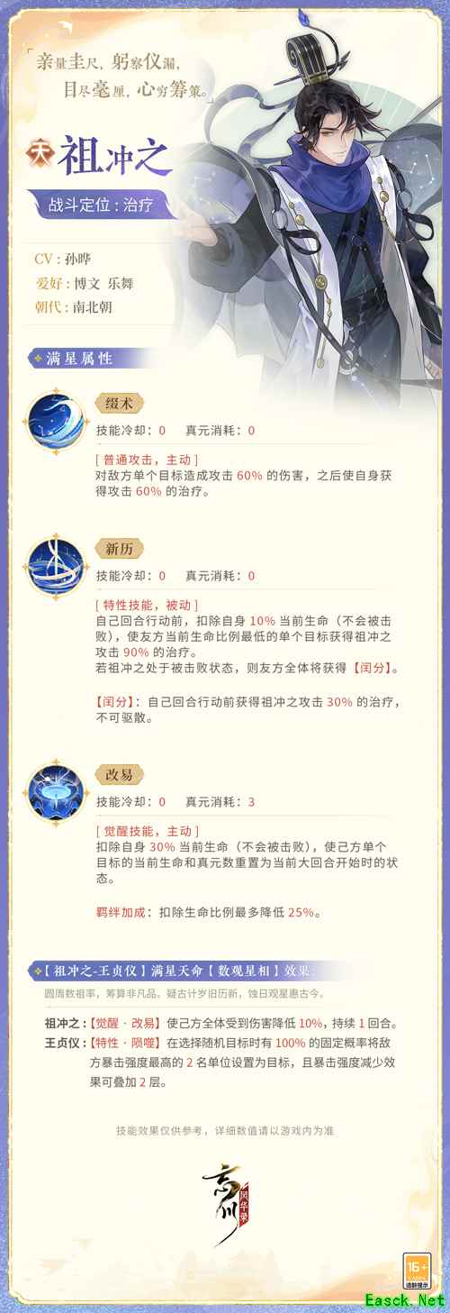 游星河万里,解机关数术 祖冲之,原是南朝宋代杰出的数学家、天文学家。他自小便专攻数术,稽古慎思,日月星辰之运转亦是其毕生喜好。 他携日晷来到忘川,谁也没想到,精研天文数术的祖冲之,竟是忘川头一号慢性子。 温吞性子下的他以敏捷的思维与偏僻入里的观点,吸引着忘川各位名士与他深谈,从日月星辰间,悟亘古之理。 技能介绍 祖冲之在战斗中作为治疗出战!【缀术】为普通攻击,能够恢复造成伤害的百分比治疗用于续航,提高自身生存能力。 【新历】为特性被动技能,【改易】为觉醒技能,触发羁绊时扣除生命比例最多降低25%。