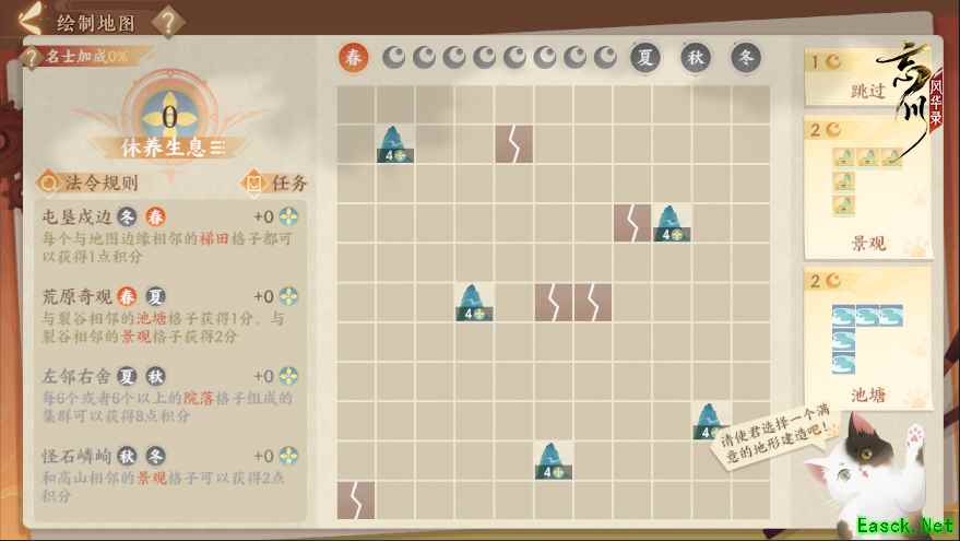 每局游戏在地图左侧有4条法令规则,春、夏、秋、冬每个季节生效其中的2条。玩家“使君”需要合理选择右侧的地块,根据规则组合在季节结束时,将积分计入到相应的法令中。摆放地块会消耗时间,时间消耗完则季节结束。除此之外,选择带积分标识的地块,或者将带积分标识的山脉包围,也可以得分,得分会立即计入总分。快来赢取心仪的奖励吧!