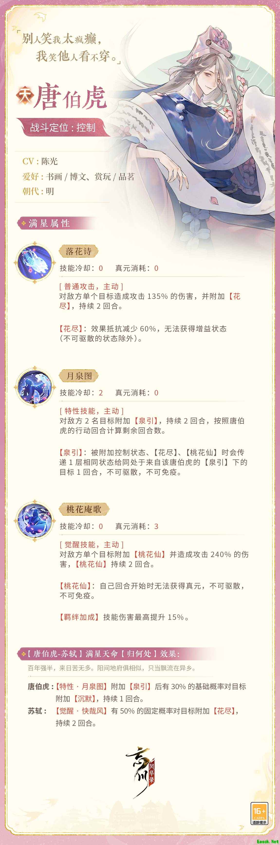 技能介绍 唐伯虎在战斗中作为控制出战!他以技能【落花诗】为普通攻击,【月泉图】为特性技能,【桃花庵歌】为觉醒技能,触发羁绊时技能伤害最高提升15%,风露清愁,俊秀清雅!