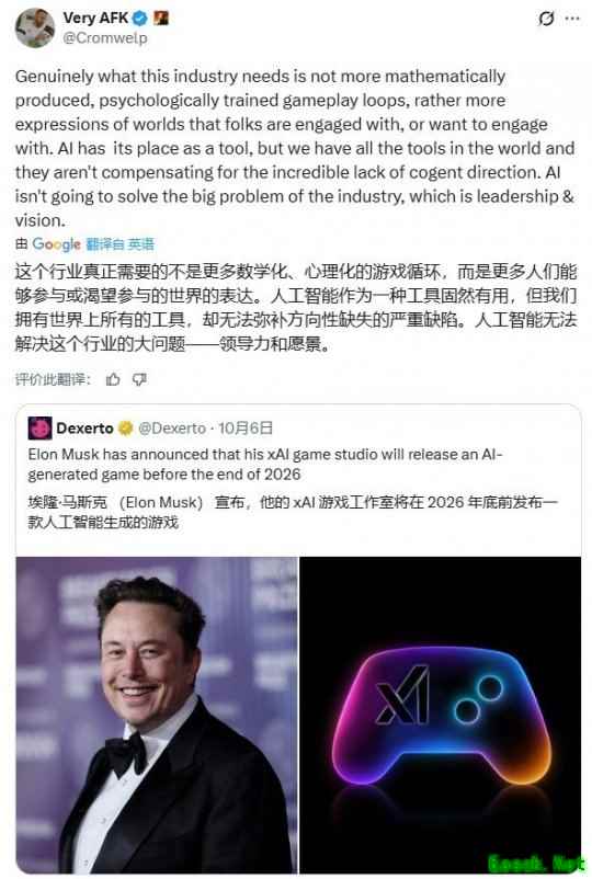 马斯克本周在社交平台宣布:“xAI游戏工作室将在明年底前推出一款出色的AI生成游戏。”然而Douse对此明显持怀疑态度。他在相关动态下犀利指出: “这个行业真正需要的,根本不是更多通过数学计算、经过心理学训练的玩法循环,而是更多能让人沉浸其中、心向往之的世界呈现。AI作为工具自有其价值,但即便拥有全世界的工具,也无法弥补清晰方向的严重缺失。AI解决不了行业的根本问题——领导力与远见。”