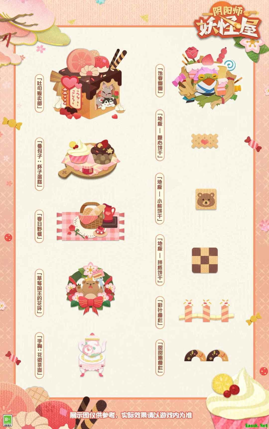 【妖怪屋装饰上新】 上新装饰: 「拼格饼干」、「小熊饼干」 「糖心饼干」、「草莓国王的花环」 「彩针栅栏」、「甜甜圈栅栏」 「春日野餐」、「吐司贩卖部」 「手鞠:花瓷茶壶」、「叠包子:杯子蛋糕」 「雕像:饴春馥馥」 上新时间: 3月2日维护更新后 获取途径: 家主完成主题任务 可获得「雕像:饴春馥馥」 其他新装饰 可通过妖怪农场主题兑换商店获取 【关于《阴阳师:妖怪屋》手游】 阴阳师IP全新休闲养成游戏《阴阳师:妖怪屋》,和风剪纸,Q萌式神,奇妙的庭院里有无限欢乐,小妖怪们正在等你回家! |