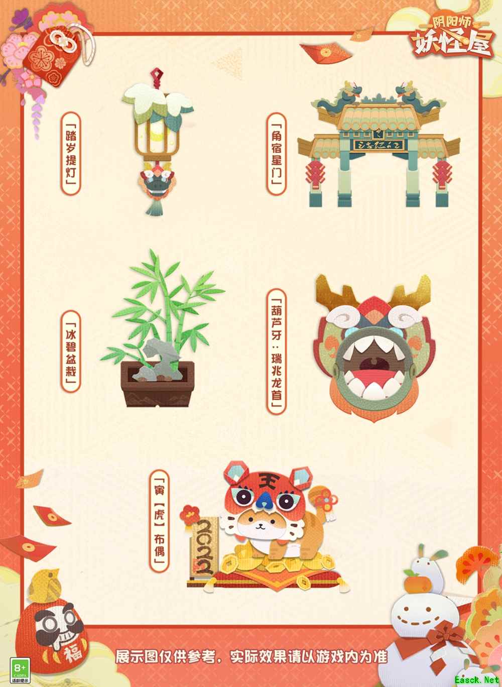 【装饰上新】 龙灯踏岁主题装饰上新 上新时间 1月26日维护后-2月6日23:59 获取途径 可通过商店购买获取 寅【虎】布偶装饰上新 上新时间 1月26日维护后-2月6日23:59 获取途径 可通过召唤活动获取奖励 【关于《阴阳师:妖怪屋》手游】 阴阳师IP全新休闲养成游戏《阴阳师:妖怪屋》,和风剪纸,Q萌式神,奇妙的庭院里有无限欢乐,小妖怪们正在等你回家! |