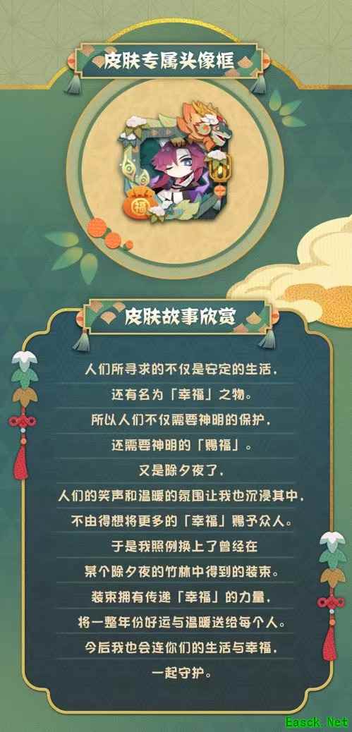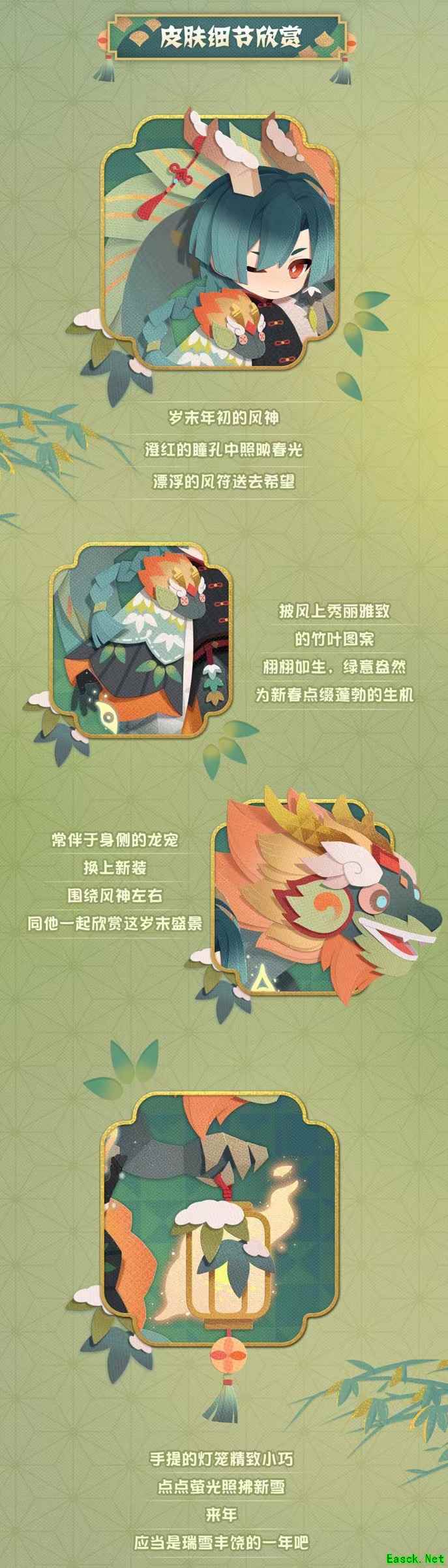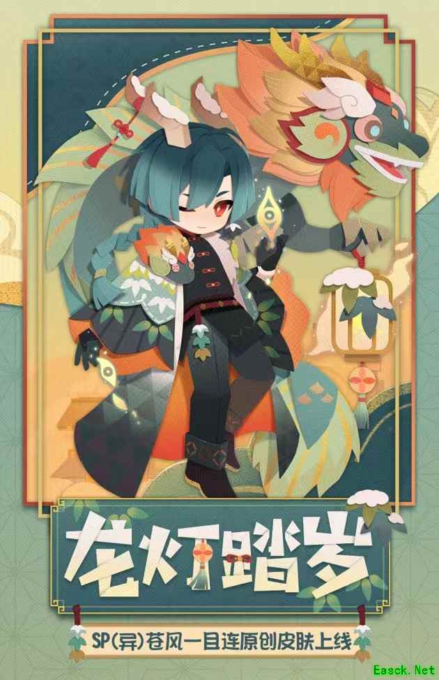 ☆苍风一目连·「龙灯踏岁」纸韵皮肤预告☆ 温柔的神明决心将人们的愿望与幸福一起守护,在阖家团圆之际,为人间捎去和煦的轻风。这一声声的祝语中,是否就有那位神明的心声? 【皮肤静态欣赏】