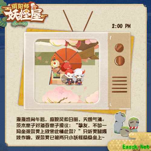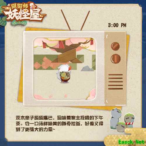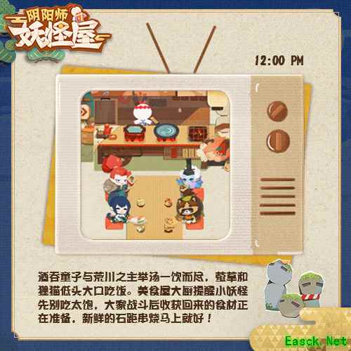 “干杯!——”,酒吞童子与荒川之主举汤一饮而尽,萤草和狸猫低头大口吃饭,美食屋大厨提醒小妖怪先别吃太饱,大家战斗后收获回来的食材正在准备,新鲜的石距串烧马上就好! 【2:00 PM 相约观景】