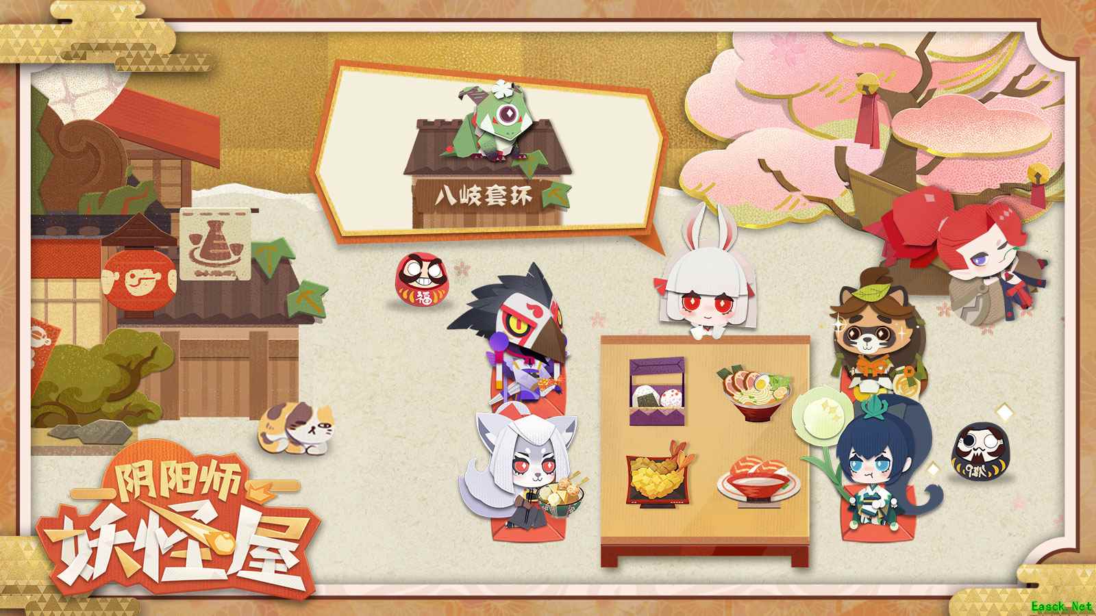 【Q萌和风剪纸,独特画风勾勒全新视界】 要说《阴阳师:妖怪屋》最为独特的,就是和风剪纸的趣萌画风了。在这里,战斗力拔群的大妖怪们都化身为了Q版剪纸形象的小妖怪;而室内外场景、植物、食物等同样都是精致的平面剪纸造型。