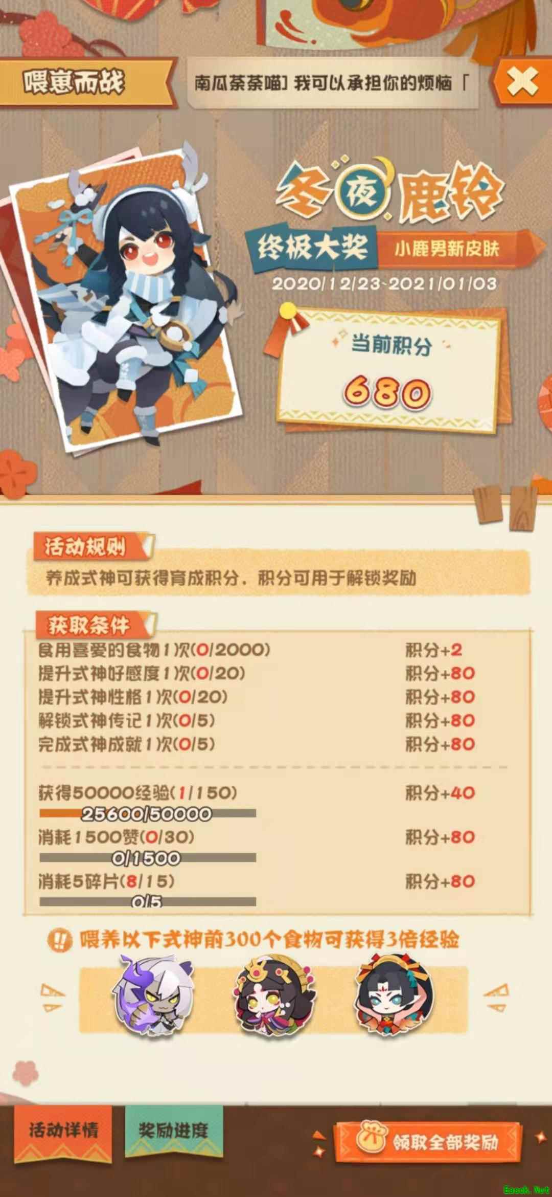 皮肤获取方式:通过参与新版「喂崽而战」活动可免费获得 ♢「喂崽而战」活动介绍♢ ※家主可选择活动推荐或者喜欢的式神进行培育,完成对应的养成任务后可获取积分。 ※家主可通过累计一定的积分后获得皮肤『小鹿男·冬夜鹿铃』、剪刀、圣诞主题装饰、食物等奖励。