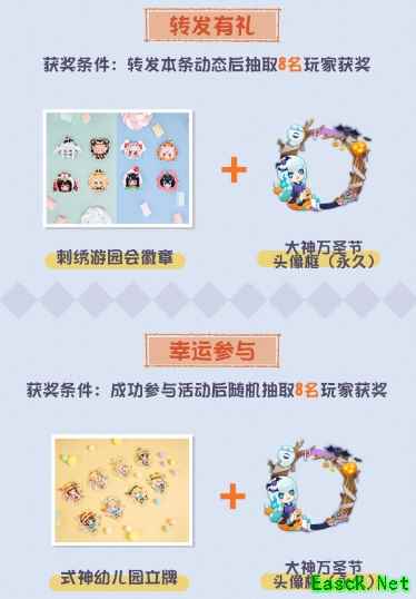 不仅如此,《阴阳师:妖怪屋》还将抽取8位转发了本次活动动态的家主大人,送出刺绣游园会徽章和大神万圣节永久头像框!再安排8个随机款式神幼儿园立牌和大神万圣节永久头像框静待有缘人。
