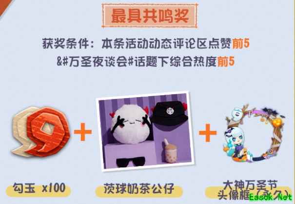 11月9日-11月15日期间,在本次活动动态评论区点赞前5名和#万圣夜谈会#话题下综合热度前5名的家主大人将获得勾玉×100、茨球奶茶公仔和大神万圣节永久头像框。