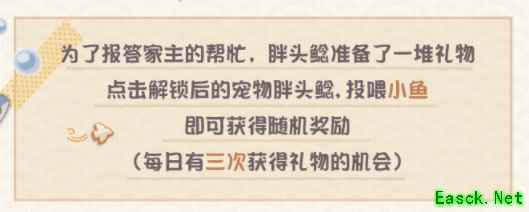 在解锁宠物胖头鲶后,家主们千万不要忘记每天去给它投喂小鱼并获取奖励哦! 胖头鲶甩动着尾巴,鱼肚子也砸在水面上,似乎想助家主一臂之力。但是放心吧,有些事交给家主就好了~ |