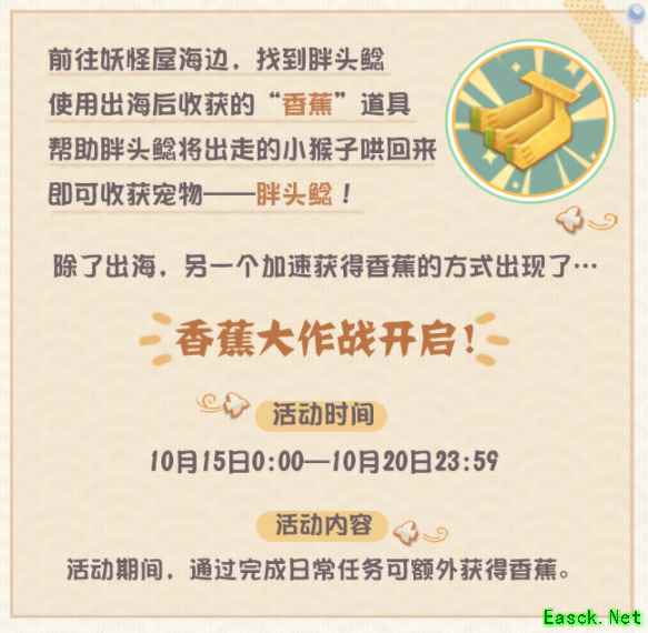 ♢香蕉大作战开启♢ 活动时间: 10月15日0:00—10月20日23:59 活动内容: 活动期间,完成日常任务可额外获得香蕉。香蕉用于解锁宠物胖头鲶。 活动结束后,家主仍可在出海时触发随机特殊事件获得香蕉。 【宠物赠礼】