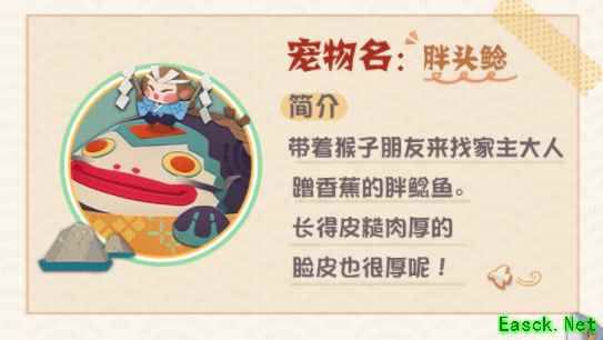 【全新宠物·胖头鲶】 ♢全新宠物胖头鲶登场♢ 上线时间: 10月14日更新维护后 获取方式: 前往妖怪屋海边,找到胖头鲶。使用出海后收获的“香蕉”道具,帮助胖头鲶将出走的小猴子哄回来,即可收获宠物——胖头鲶!