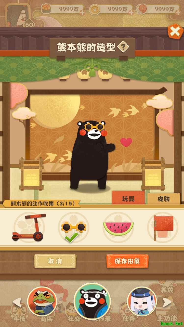 当然“棚拍”特写也可以有! 点开熊本熊造型界面,给部长做一波新造型!右下角拍摄按钮点起来!记得加滤镜、瘦脸、美颜哦~又能卖萌又能当家的,熊本熊让人心动指数up! ○熊本熊的新衣○ 为了欢迎新朋友的到来,妖怪屋建设委员会给熊本熊,定制了三套新衣服。卖家秀奉上~