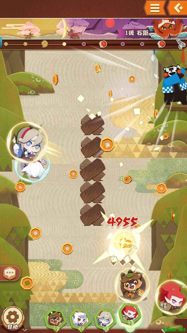 退治时,爱好和平的熊本熊会化身协战小精灵,随机向战场撒出金币雨,为家主提高金币收益。 ○庭院小精灵○ 男孩子就应该有两个面孔!熊本熊不仅能担任招财熊熊,回到庭院还会自动切换成修家具的“小匠熊”。