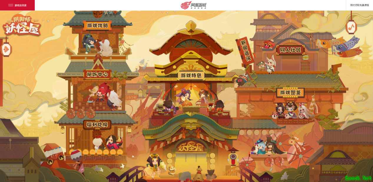 与之前的官网相比,装修后的官网展现了妖怪屋热闹非凡的场景,错落的楼宇、精致的和风装饰,还有路上行走着的小妖怪们,都让整个画面充满了生气。