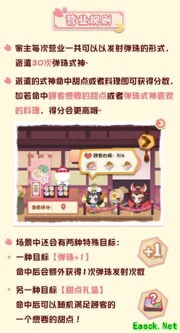 ※家主每天都有2次免费机会参与营业,以及使用勾玉额外购买1次参与营业的机会。 ※家主每天将有3次见习模式的参与机会,见习模式无法获得奖励,但完成订单的评分记录会被保存,家主可在正式营业前参与见习模式锻炼一下技巧哦! ※家主参与营业后,可根据营业的结算评分获得相应数量的『樱花券』,樱花券可以在『兑换屋』中兑换奖励。
