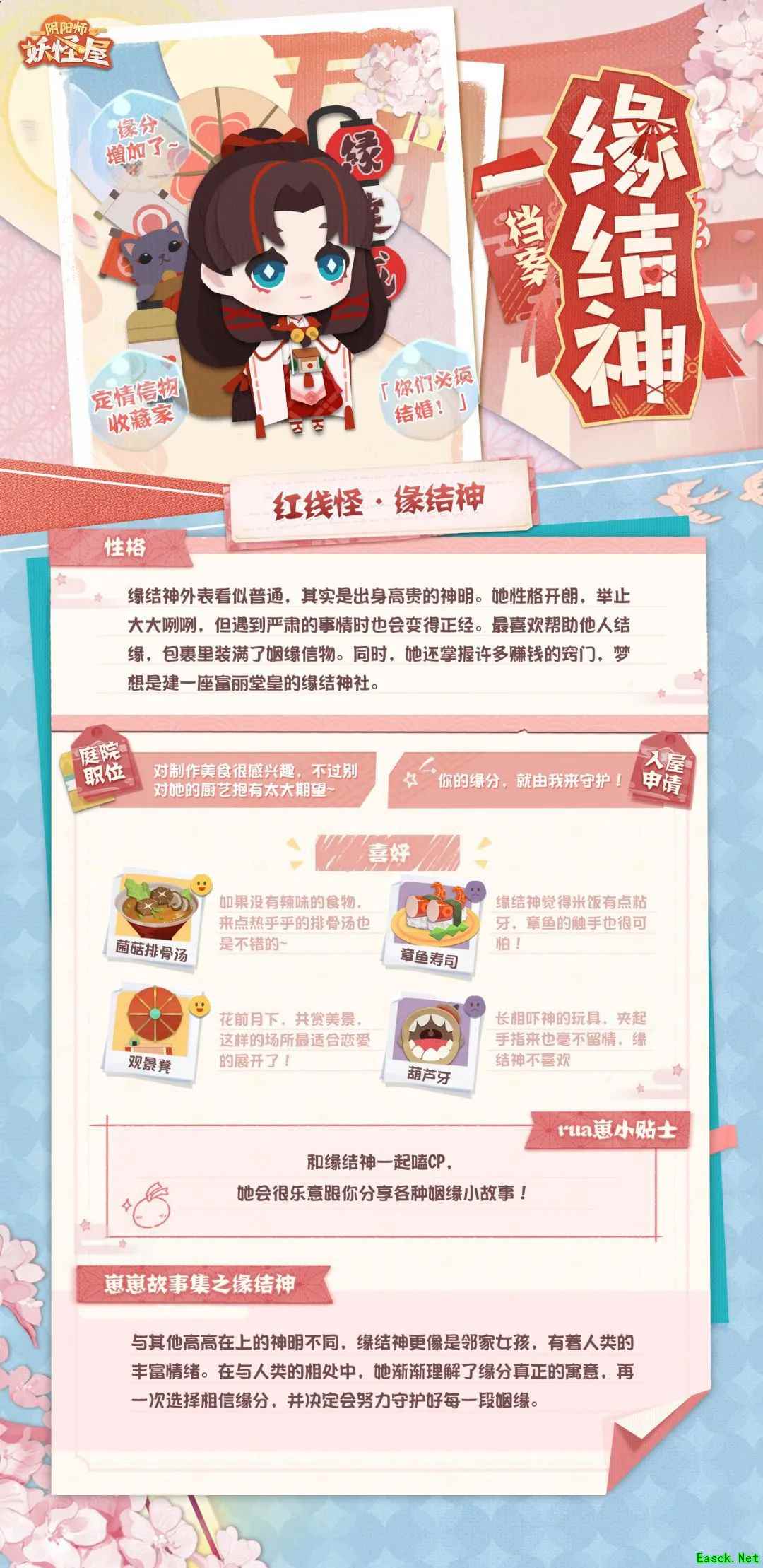 【新入住小妖怪情报介绍·缘结神】 作为初来乍到的小妖怪,缘结神主动向家主和登记小纸人递上了她的档案,希望能快点与家主以及庭院里的小妖怪们熟络起来!(以便开启日后的结缘工作(???)?) <小妖怪动画欣赏·缘结神> 「从今天起,大家的缘分就由我来守护!」 <小妖怪静态欣赏·缘结神>
