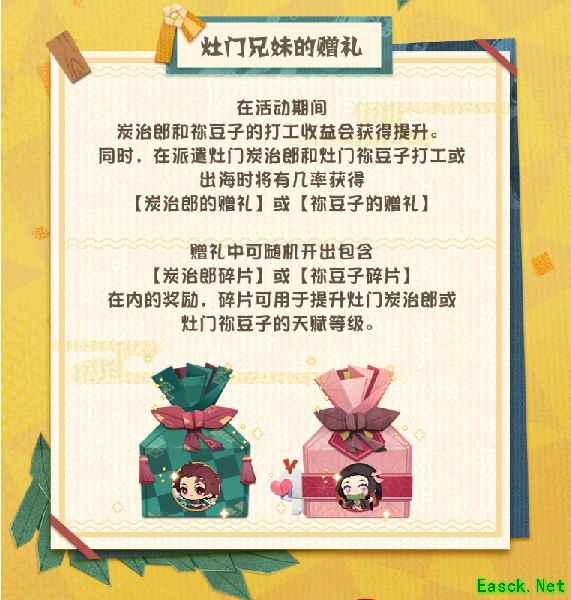 ※在活动期间,「灶门炭治郎」和「灶门祢豆子」的打工收益会获得提升。同时,在派遣「灶门炭治郎」和「灶门祢豆子」打工或者出海时将有几率获得【炭治郎的赠礼】或【祢豆子的赠礼】 ※赠礼中可随机开出包含【炭治郎碎片】或【祢豆子碎片】在内的奖励,碎片可用于提升灶门炭治郎或灶门祢豆子的天赋等级。 更多联动情报,敬请期待后续报道! 和小妖怪们一起叠包子、逗大胖…… 脑海里已经出现许多个欢乐的画面了 在今后的日子里,大家一起来创造令人难忘的温暖时光吧! |