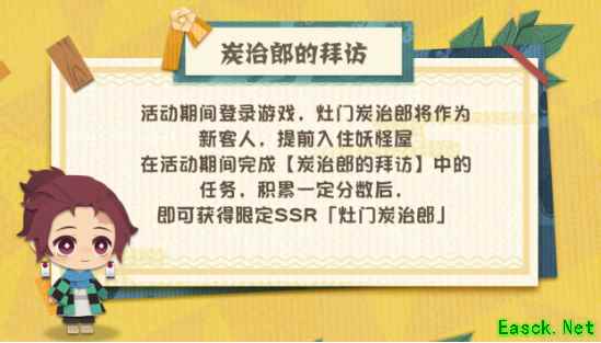 ※活动期间登录游戏,限定SSR「灶门炭治郎」将作为新客人,提前入住妖怪屋。 ※在活动期间完成【炭治郎的拜访】中的任务,积累一定分数后,即可获得限定SSR「灶门炭治郎」 【联动角色概率UP】